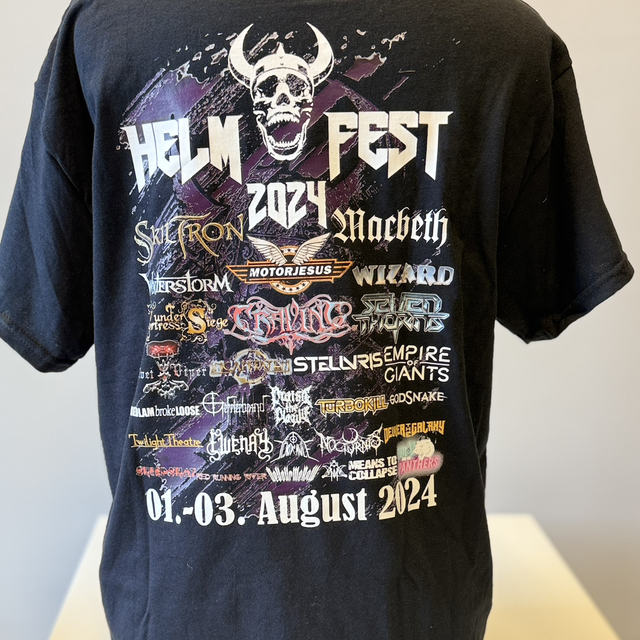 Das alternative HelmFest-Shirt aus 2024 trägt das allererste Festivaldesign von David Waschk, das sich durch seinen markanten, künstlerischen Stil und die rohe Kraft eines echten Metal-Artworks auszeichnet. Mit dem ikonischen Helm-Schädel in Violett auf der Front und dem kompletten Band-Lineup auf der Rückseite ist dieses Shirt ein Must-have für alle Festival-Gänger und Sammler.